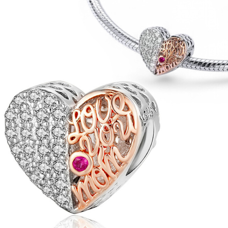 Wykonany w całości ze srebra najwyższej próby S925 z dbałością o każdy szczegół, piękny klasyczny kształt serca podzielonym na dwie połowy, jedna strona wypełniona lśniącymi cyrkoniamy sześciennymi, po drugiej stronie znajduje się ażurowy napis "love you mom" w odcieniu rose. Dodatkowo ozdobionym purpurowym kryształkiem.